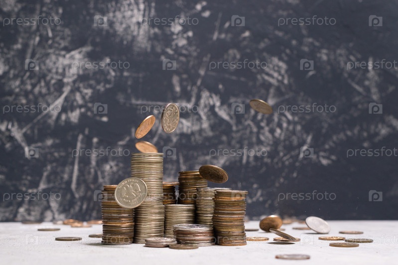 Стопки российских монет разной высоты на сером бетонном полу и темно-сером фоне и падающие монеты