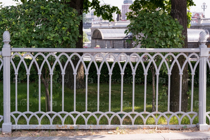 Серый стальной забор (ограда) на фоне травы и деревьев