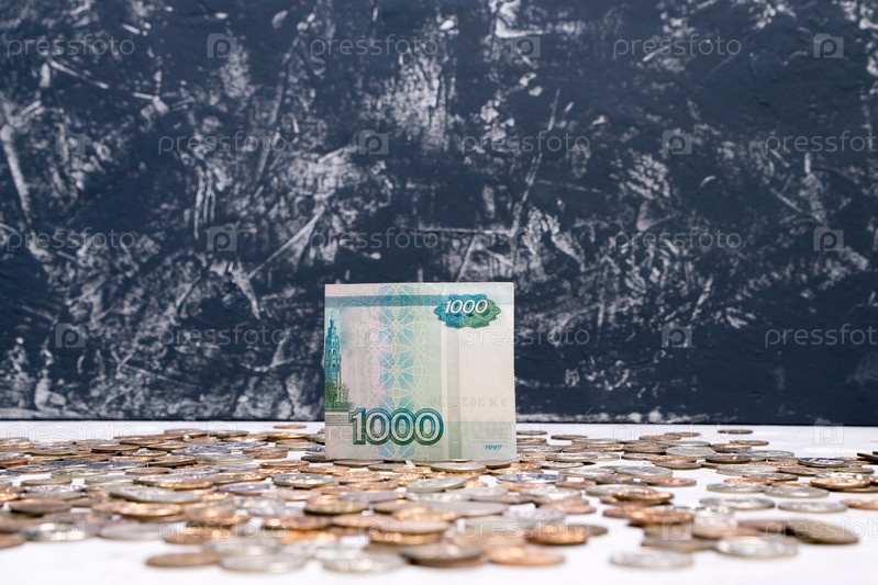 Россыпь российских монет на бетонном полу и на сером фоне купюра в 1000 рублей