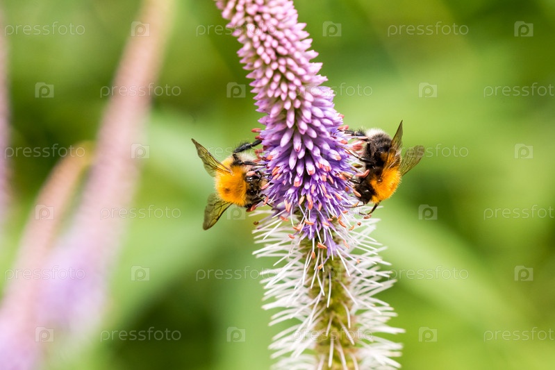 Пчела собирает нектар с цветов на зеленом размытом фоне