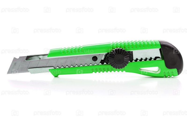 Зеленый канцелярский нож на белом фоне с тенью