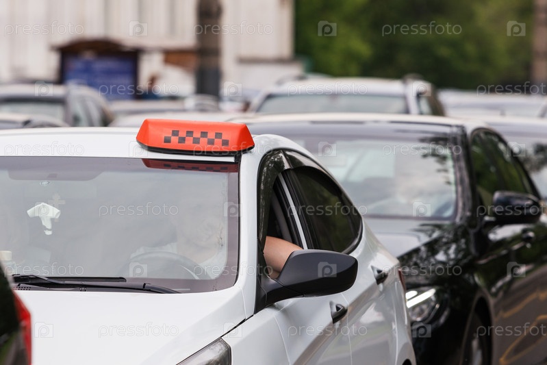 Оранжевый значок такси в автомобильной пробке на белой крыше