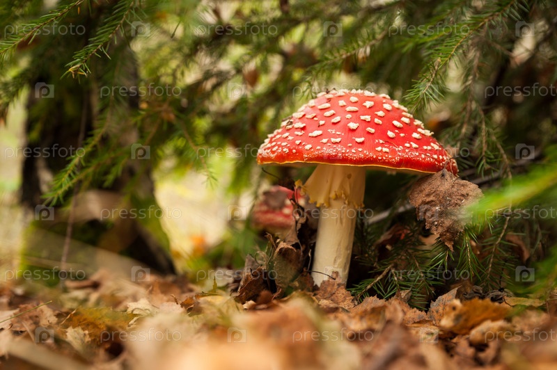 Ядовитый гриб Amanita muscaria под деревом в упавших листьях