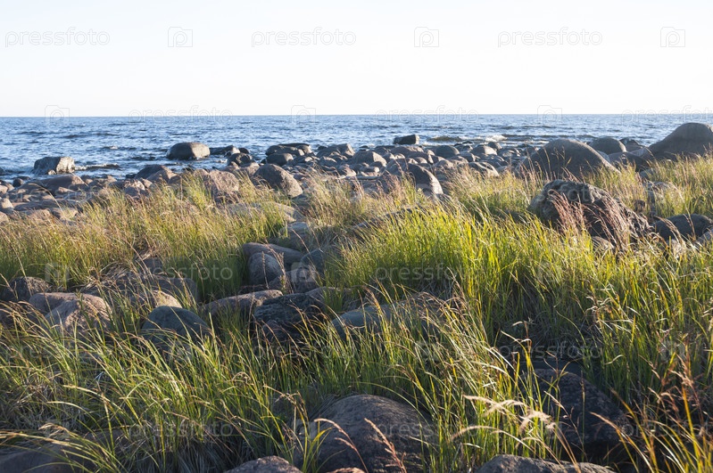 Большие круглые камни в зеленой траве на берегу моря, озера