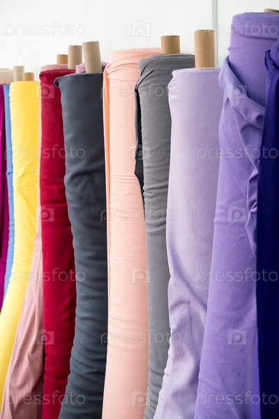 Несколько рулонов цветных тканей стоят вдоль белой стены