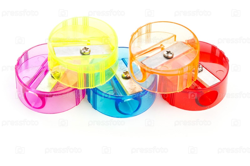 Пять разноцветных пластиковых точилок для карандашей на белом фоне