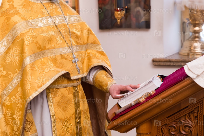 Священник в желтом облачении с крестом на груди держит в руке страницу Библии