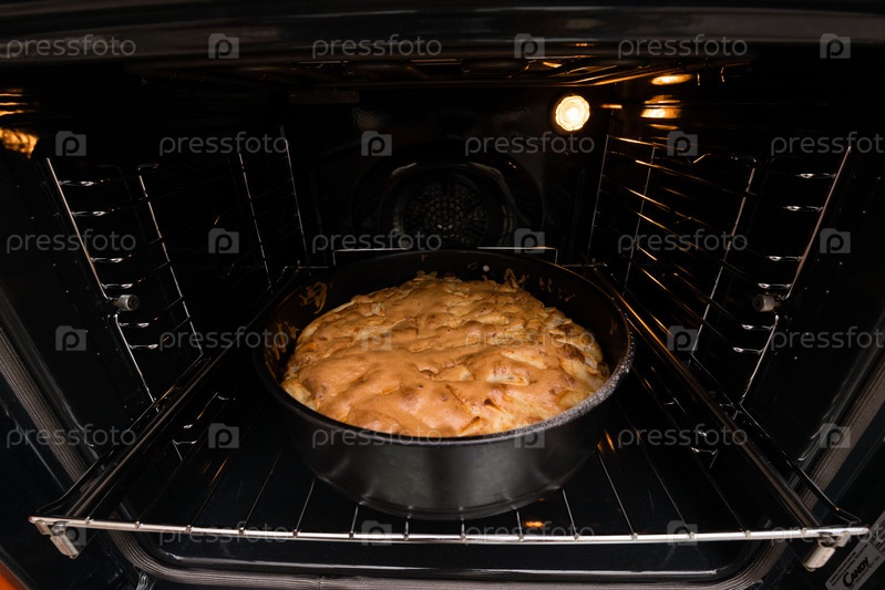 Приготовленный домашний яблочный пирог стоит на решетке в духовке широкий угол