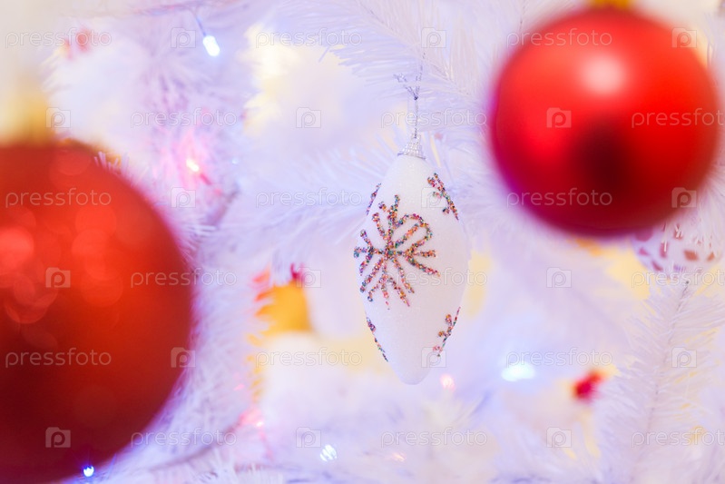 Рождественские игрушки на белой елке крупным планом