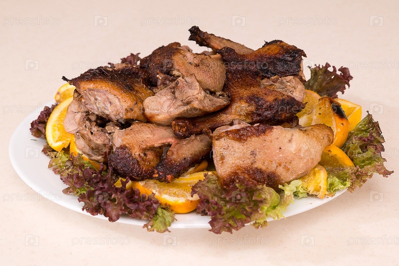 Утка-гриль с дольками лимона лежит на зеленых листьях