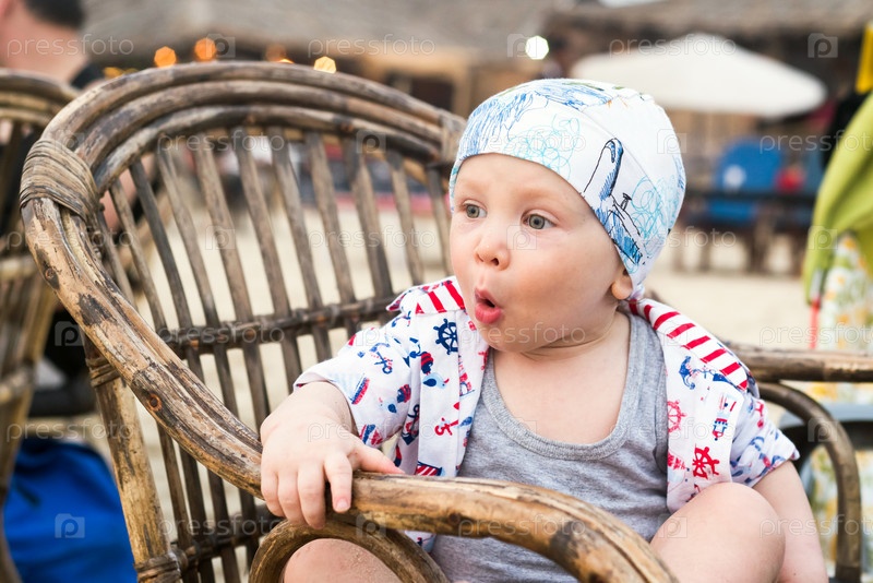 Маленький мальчик с сильным удивлением на лице сидит в плетеном кресле