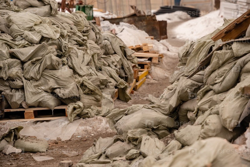 Горы зеленых строительных пластиковых мешков со строительным мусором