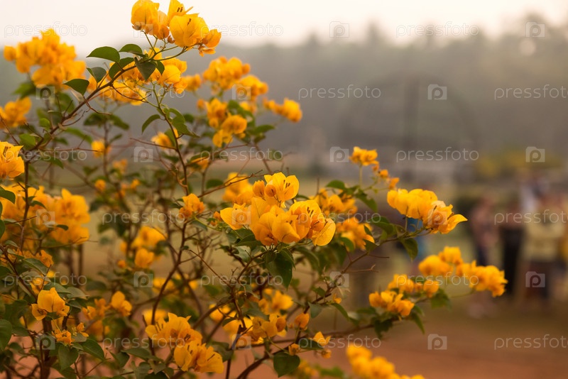 Кустарник, цветущий желтыми цветами в лучах рассветного солнца
