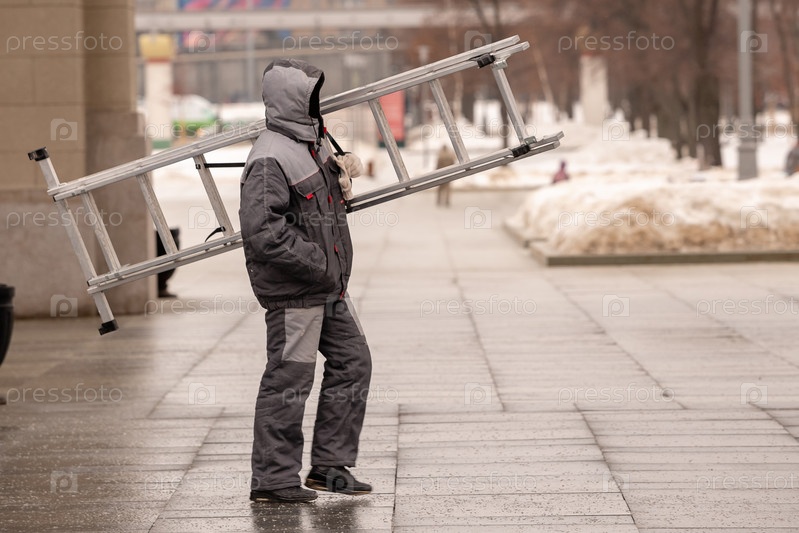 Рабочий в зимней строительной куртке несет лестницу на плече по улице