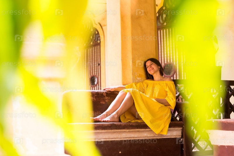 Красивая молодая девушка в желтом платье сидит на каменной скамье