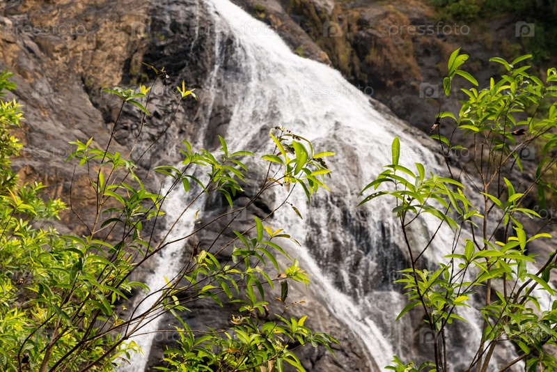 Зеленые молодые свежие листья на фоне водопада Дудхсагар в ГОА / Индия