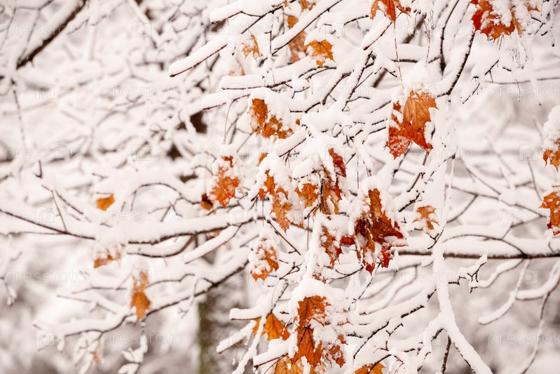 Увядшие коричневые листья клена на заснеженных ветвях зимой после снегопада