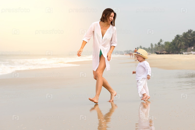 Молодая красивая девушка в белой рубашке бежит по песчаному пляжу в море со своим сыном в белой одежде и шляпе