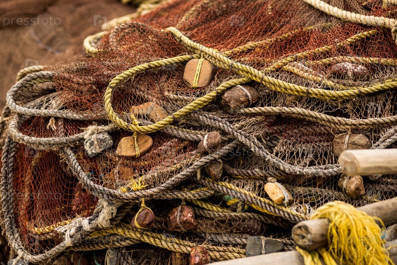 Старая рыболовная сеть с поплавками, разложенная на судне крупным планом