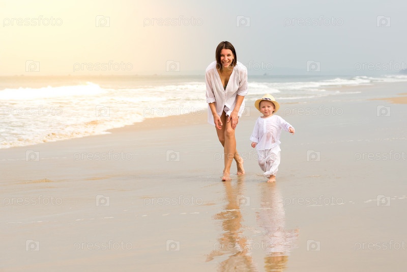 Молодая красивая девушка в белой рубашке бежит по песчаному пляжу в море со своим сыном в белой одежде и шляпе