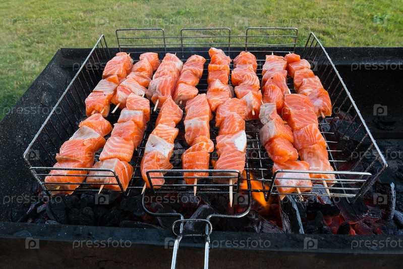 Шашлык из горбуши готовится на углях в мангале