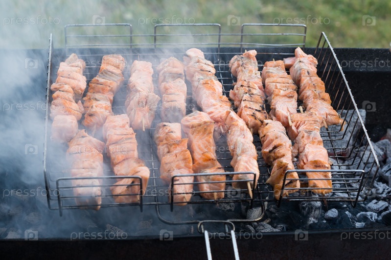 Шашлык из горбуши на углях в мангале в готовом виде