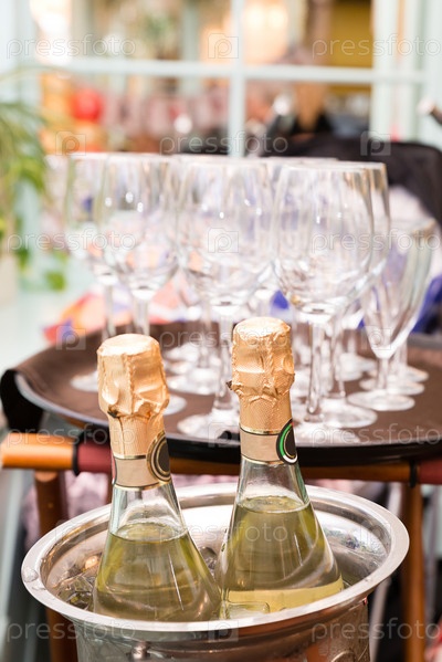 Две бутылки шампанского в металлическом ведерке со льдом на фоне бокалов