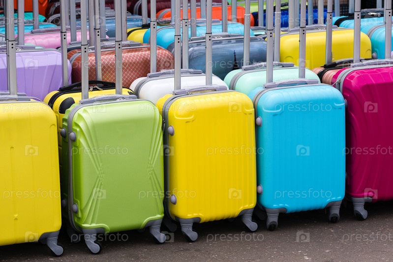 Ряды больших разноцветных чемоданов для путешествий