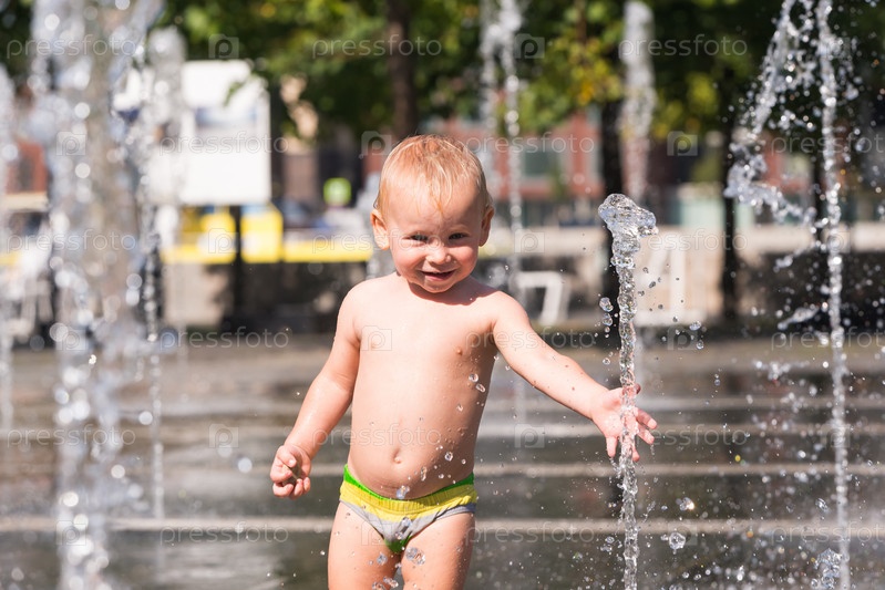 Улыбающийся маленький мальчик в жаркий летний день играет со струей воды уличного фонтана