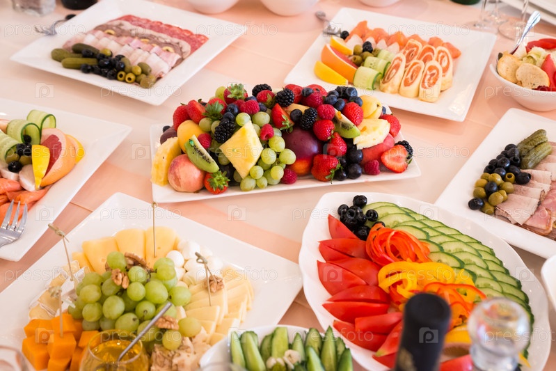 Праздничный стол с фруктами и закусками на банкете в ресторане