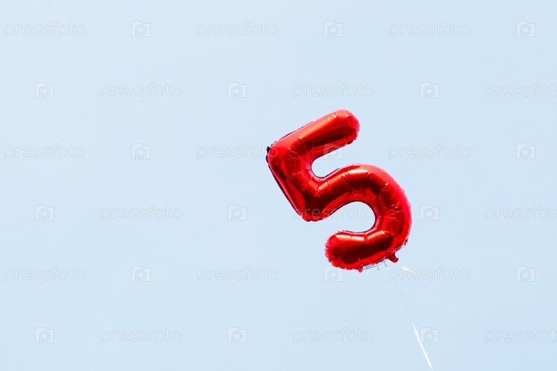 Красный шарик с гелием в форме цифры пять летит в голубое небо