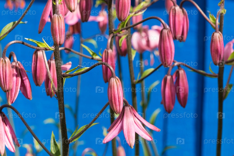 Цветок лилии кудреватой на синем фоне