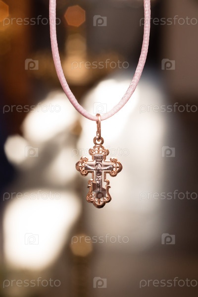 Христианский крест из золота на фоне храма крупным планом