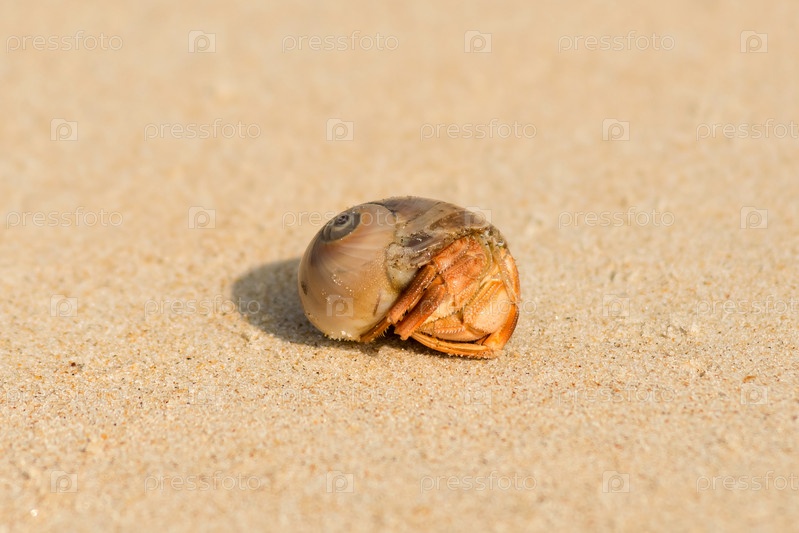 Рак-отшельник в раковине лежит на желтом песке в солнечный день