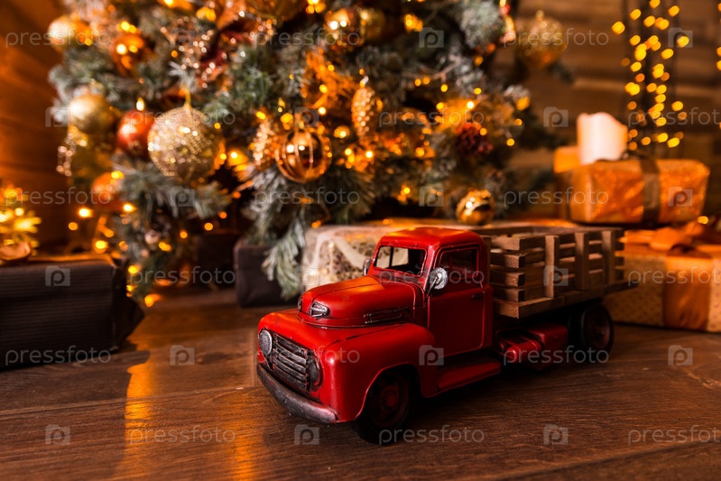 Игрушечная машинка с красным кузовом стоит на деревянном полу под елкой с подарками
