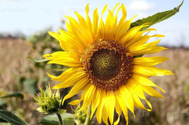 Ярко-желтый цветок подсолнечника на фоне ржаного поля и голубого неба