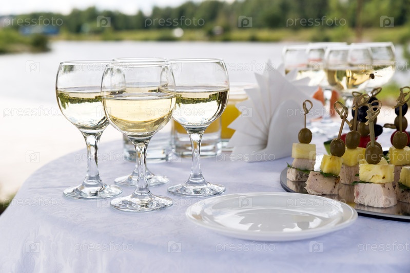 Круглый белый стол с бокалами шампанского и зеркальным блюдом с канапе на природе