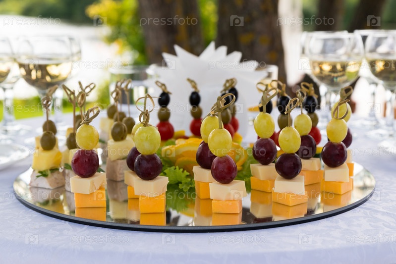 Зеркальный поднос с фруктами и сырными канапе на круглом белом столе на открытом воздухе