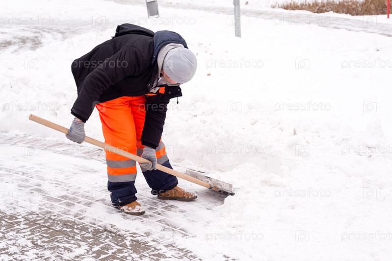 Женщина-уборщица или дворник в комбинезоне убирает снег с дорожки в парке лопатой