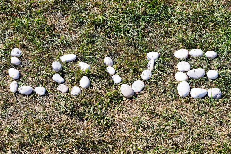 Надпись «любовь» выложена круглыми морскими камнями на траве