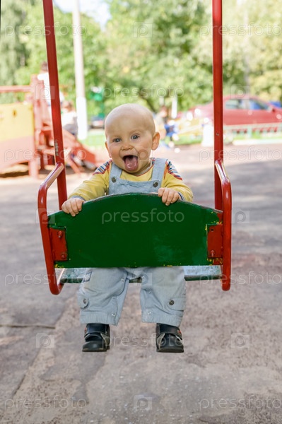 Маленький мальчик качается на качелях с улыбкой и высунутым языком