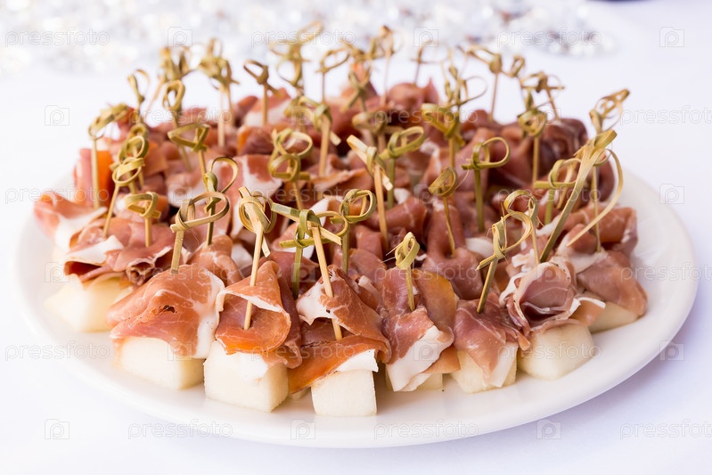 Канапе с солониной и ломтиками дыни на шпажках