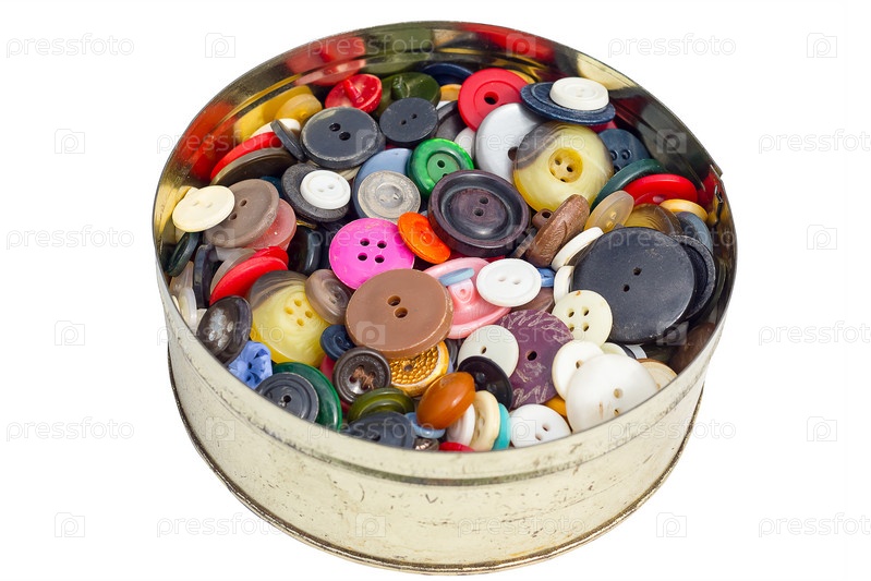 Цветные пуговицы из старой одежды для поделок в круглой металлической банке