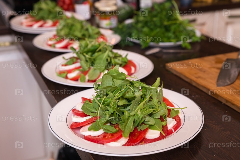 Тарелки с помидорами, моцареллой и базиликом на сервировочном кухонном столе