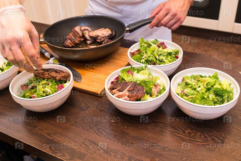 Шеф-повар в бардачке с жареной куриной грудкой и салатом