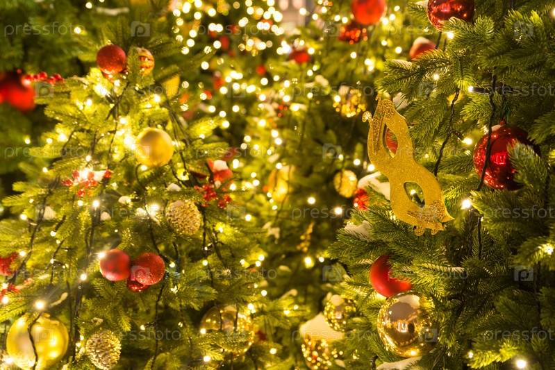 Красные и золотые рождественские украшения и шары на елке с желтыми гирляндами