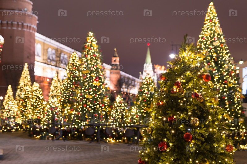 Рождественское или новогоднее украшение улиц Москвы елками и гирляндами