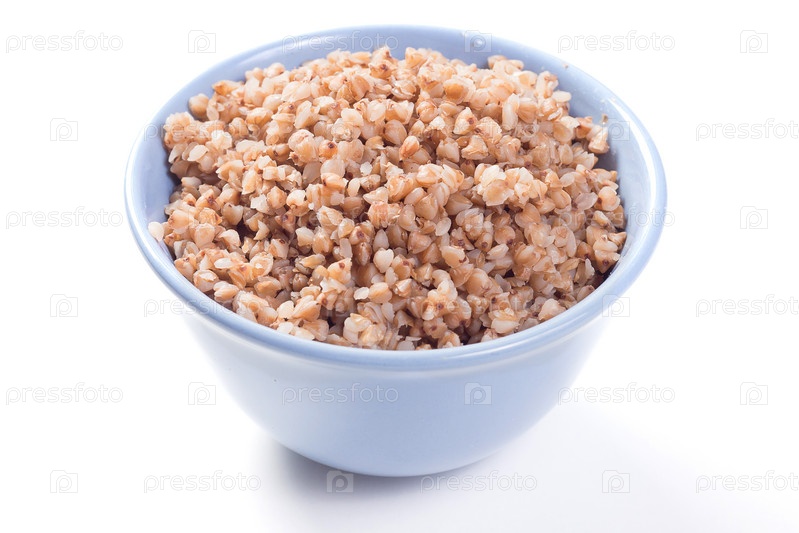 Вареная гречка в синей тарелке на белом фоне с тенью