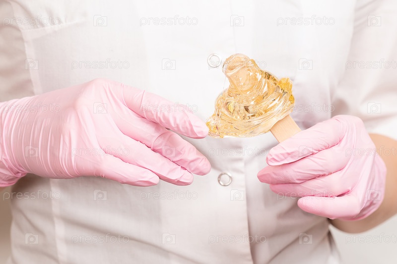 Сахарная паста для шугаринга и депиляции на деревянной палочке в руках косметолога в розовых латексных перчатках