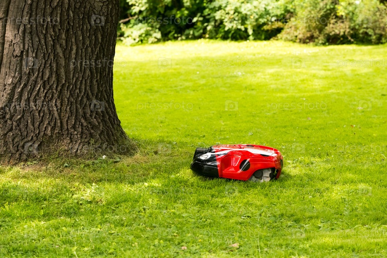 Робот-газонокосилка на ухоженном зеленом газоне